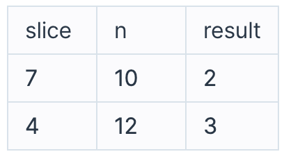 머쓱이네 피자가게는 피자를 두 조각에서 열 조각까지 원하는 조각 수로 잘라줍니다. 피자 조각 수 slice와 피자를 먹는 사람의 수 n이 매개변수로 주어질 때, n명의 사람이 최소 한 조각 이상 피자를 먹으려면 최소 몇 판의 피자를 시켜야 하는지를 return 하도록 solution 함수를 완성해보세요.