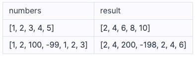 정수 배열 numbers가 매개변수로 주어집니다. numbers의 각 원소에 두배한 원소를 가진 배열을 return하도록 solution 함수를 완성해주세요.