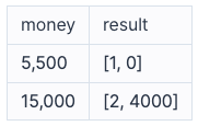 머쓱이는 추운 날에도 아이스 아메리카노만 마십니다. 아이스 아메리카노는 한잔에 5,500원입니다. 머쓱이가 가지고 있는 돈 money가 매개변수로 주어질 때, 머쓱이가 최대로 마실 수 있는 아메리카노의 잔 수와 남는 돈을 순서대로 담은 배열을 return 하도록 solution 함수를 완성해보세요.