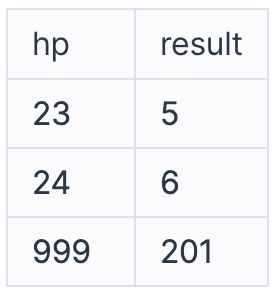 - hp가 23이므로, 장군개미 네마리와 병정개미 한마리로 사냥할 수 있습니다. 따라서 5를 return합니다.
