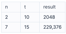 어떤 세균은 1시간에 두배만큼 증식한다고 합니다. 처음 세균의 마리수 n과 경과한 시간 t가 매개변수로 주어질 때 t시간 후 세균의 수를 return하도록 solution 함수를 완성해주세요.