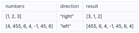 정수가 담긴 배열 numbers와 문자열 direction가 매개변수로 주어집니다. 배열 numbers의 원소를 direction방향으로 한 칸씩 회전시킨 배열을 return하도록 solution 함수를 완성해주세요.