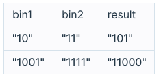 이진수를 의미하는 두 개의 문자열 bin1과 bin2가 매개변수로 주어질 때, 두 이진수의 합을 return하도록 solution 함수를 완성해주세요.