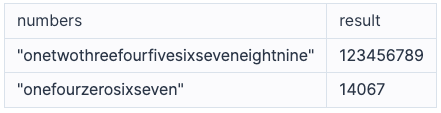 - numbers는 "zero", "one", "two", "three", "four", "five", "six", "seven", "eight", "nine" 들이 공백 없이 조합되어 있습니다.
