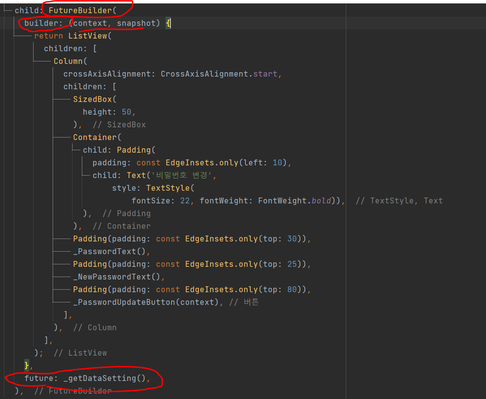 FutureBuilder 위젯을 사용할때에는 builder: 와 future: 속성이 들어가야한다.