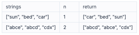 - 모든 strings의 원소의 길이는 n보다 큽니다.