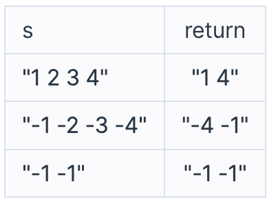 예를들어 s가 "1 2 3 4"라면 "1 4"를 리턴하고, "-1 -2 -3 -4"라면 "-4 -1"을 리턴하면 됩니다.