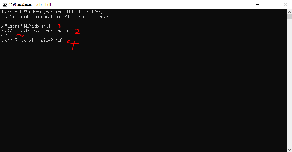 4) logcat --pid = 패키지pid값 즉, logcat --pid=21406 <<-- 입력