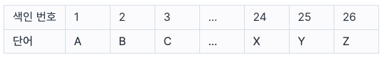이 과정을 거쳐 다섯 글자의 문장 KAKAO가 4개의 색인 번호 [11, 1, 27, 15]로 압축된다.
