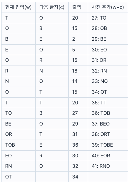 입력으로 TOBEORNOTTOBEORTOBEORNOT가 들어오면 다음과 같이 압축이 진행된다.