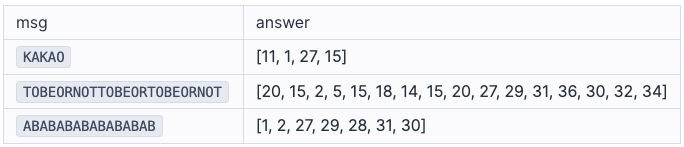 - 현재 사전에는 KAKAO의 첫 글자 K는 등록되어 있으나, 두 번째 글자까지인 KA는 없으므로, 첫 글자 K에 해당하는 색인 번호 11을 출력하고, 다음 글자인 A를 포함한 KA를 사전에 27 번째로 등록한다.