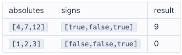 - signs[i] 가 참이면 absolutes[i] 의 실제 정수가 양수임을, 그렇지 않으면 음수임을 의미합니다.