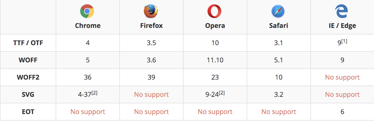 파일 크기가 작은 즉, 로딩이 빠른 확장자 순서는 WOFF2 > WOFF > OTF > TTF > EOT 이다. 때문에 WOFF2와 WOFF확장자의 폰트를 쓰는것이 좋다. WOFF2와 WOFF는 거의 모든 브라우저에서 사용할 수 있다. IE를 지원하지 않는다면 WOFF2만 사용해도 문제되지 않는다.