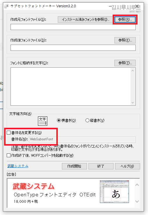 - 가장 위쪽의 빨간색 박스에서는 서브셋을 적용할 폰트를 선택한다.