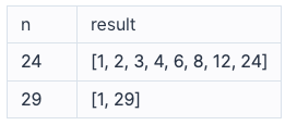 정수 n이 매개변수로 주어질 때, n의 약수를 오름차순으로 담은 배열을 return하도록 solution 함수를 완성해주세요.