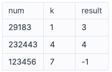 - num에 k가 여러 개 있으면 가장 처음 나타나는 자리를 return 합니다.