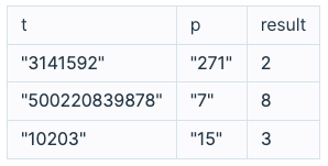 - t와 p는 숫자로만 이루어진 문자열이며, 0으로 시작하지 않습니다.