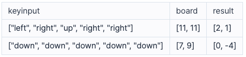 - [0, 0]은 board의 정 중앙에 위치합니다. 예를 들어 board의 가로 크기가 9라면 캐릭터는 왼쪽으로 최대 [-4, 0]까지 오른쪽으로 최대 [4, 0]까지 이동할 수 있습니다.