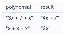 한 개 이상의 항의 합으로 이루어진 식을 다항식이라고 합니다. 다항식을 계산할 때는 동류항끼리 계산해 정리합니다. 덧셈으로 이루어진 다항식 polynomial이 매개변수로 주어질 때, 동류항끼리 더한 결괏값을 문자열로 return 하도록 solution 함수를 완성해보세요. 같은 식이라면 가장 짧은 수식을 return 합니다.