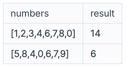 - 1, 2, 3이 numbers에 없으므로, 1 + 2 + 3 = 6을 return 해야 합니다.