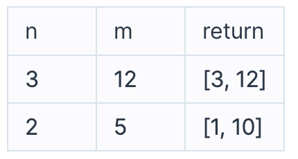 두 수를 입력받아 두 수의 최대공약수와 최소공배수를 반환하는 함수, solution을 완성해 보세요. 배열의 맨 앞에 최대공약수, 그다음 최소공배수를 넣어 반환하면 됩니다. 예를 들어 두 수 3, 12의 최대공약수는 3, 최소공배수는 12이므로 solution(3, 12)는 [3, 12]를 반환해야 합니다.