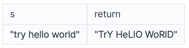 "try hello world"는 세 단어 "try", "hello", "world"로 구성되어 있습니다. 각 단어의 짝수번째 문자를 대문자로, 홀수번째 문자를 소문자로 바꾸면 "TrY", "HeLlO", "WoRlD"입니다. 따라서 "TrY HeLlO WoRlD" 를 리턴합니다.