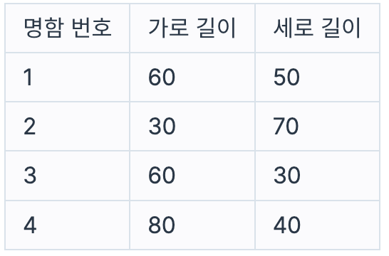 가장 긴 가로 길이와 세로 길이가 각각 80, 70이기 때문에 80(가로) x 70(세로) 크기의 지갑을 만들면 모든 명함들을 수납할 수 있습니다. 하지만 2번 명함을 가로로 눕혀 수납한다면 80(가로) x 50(세로) 크기의 지갑으로 모든 명함들을 수납할 수 있습니다. 이때의 지갑 크기는 4000(=80 x 50)입니다.