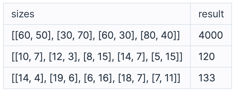 모든 명함의 가로 길이와 세로 길이를 나타내는 2차원 배열 sizes가 매개변수로 주어집니다. 모든 명함을 수납할 수 있는 가장 작은 지갑을 만들 때, 지갑의 크기를 return 하도록 solution 함수를 완성해주세요.