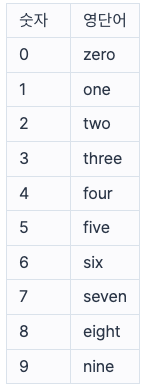 참고로 각 숫자에 대응되는 영단어는 다음 표와 같습니다.