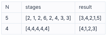 전체 스테이지의 개수 N, 게임을 이용하는 사용자가 현재 멈춰있는 스테이지의 번호가 담긴 배열 stages가 매개변수로 주어질 때, 실패율이 높은 스테이지부터 내림차순으로 스테이지의 번호가 담겨있는 배열을 return 하도록 solution 함수를 완성하라.