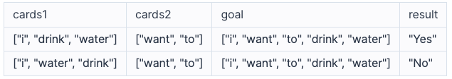 - cards1, cards2, goal의 문자열들은 모두 알파벳 소문자로만 이루어져 있습니다.