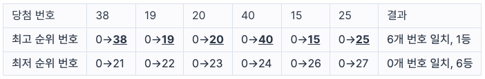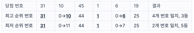 알아볼 수 없는 번호를 0으로 표기하기로 하고, 민우가 구매한 로또 번호 6개가 44, 1, 0, 0, 31 25라고 가정해보겠습니다. 당첨 번호 6개가 31, 10, 45, 1, 6, 19라면, 당첨 가능한 최고 순위와 최저 순위의 한 예는 아래와 같습니다.