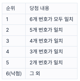 - 순서와 상관없이, 구매한 로또에 당첨 번호와 일치하는 번호가 있으면 맞힌 걸로 인정됩니다.