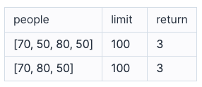 - 구명보트의 무게 제한은 항상 사람들의 몸무게 중 최댓값보다 크게 주어지므로 사람들을 구출할 수 없는 경우는 없습니다.