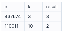 정수 n과 k가 매개변수로 주어집니다. n을 k진수로 바꿨을 때, 변환된 수 안에서 찾을 수 있는 위 조건에 맞는 소수의 개수를 return 하도록 solution 함수를 완성해 주세요.