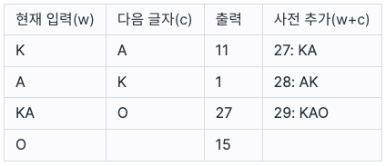 - 현재 사전에는 KAKAO의 첫 글자 K는 등록되어 있으나, 두 번째 글자까지인 KA는 없으므로, 첫 글자 K에 해당하는 색인 번호 11을 출력하고, 다음 글자인 A를 포함한 KA를 사전에 27 번째로 등록한다.