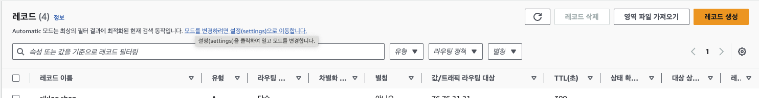 Route53 호스팅에 들어와 "레코드 생성" 버튼 클릭