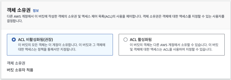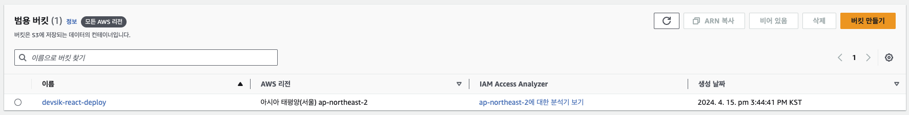 나머지 옵션들은 기본 옵션으로 둔 뒤 버킷 만든 뒤 만들어진 버킷 확인