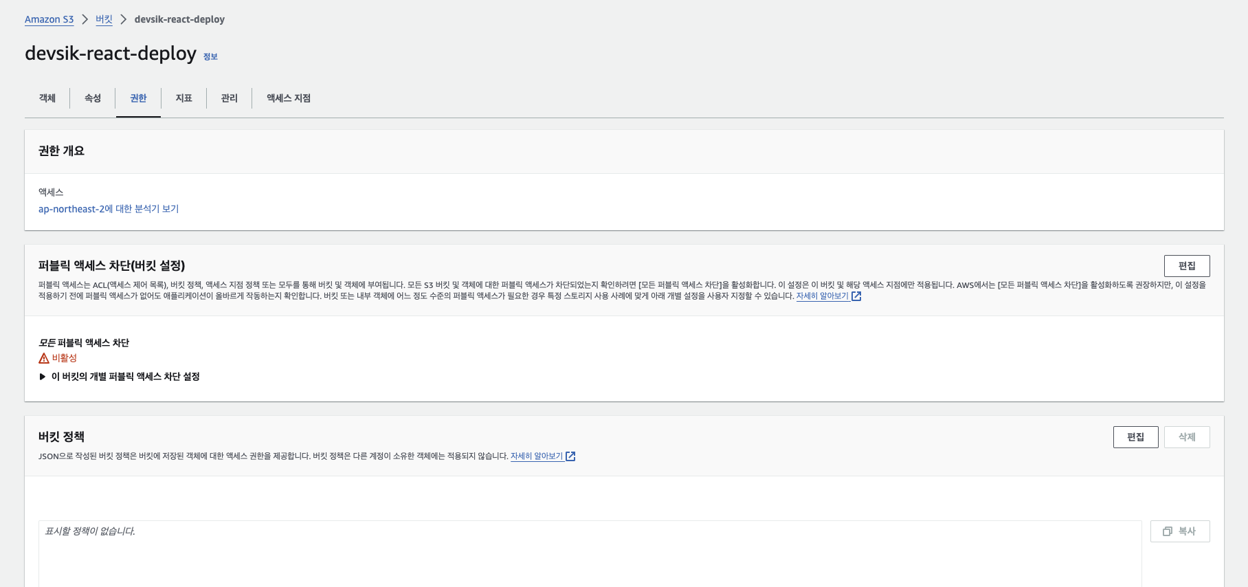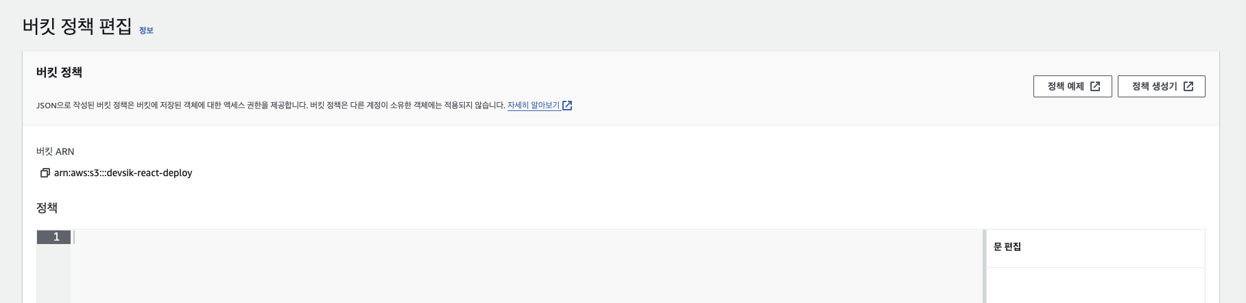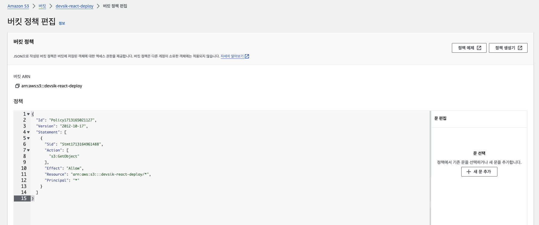 버킷 상세페이지의 권한 탭으로 이동한뒤 아래쪽에 있는 "버킷 정책" 옆 편집버튼 클릭