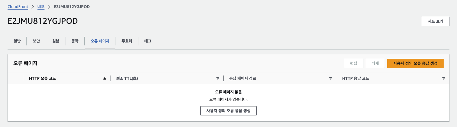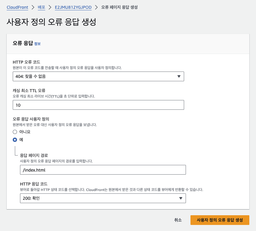 CloudFront -> 상세 -> "오류 페이지 탭"에서 "사용자 정의 오류 응답 생성" 버튼 클릭