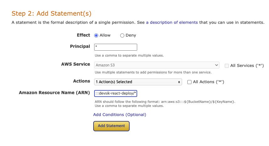 Amazon Resource Name(ARN)에는 "버킷 -> 속성 -> ARN 복사 후 끝에 /* 를 붙여준다"