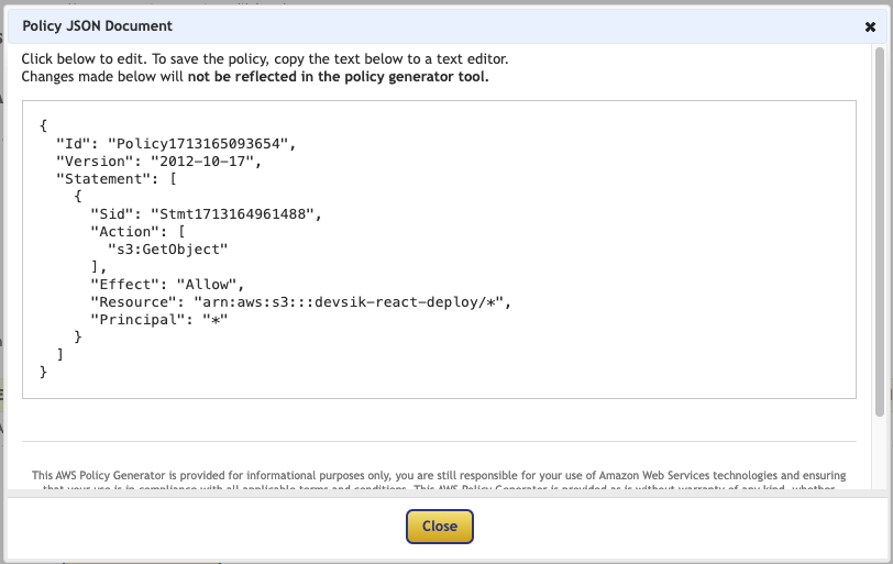 "Add Statement" 버튼 클릭 후 "Generate Policy" 버튼 클릭 이후 나온 json을 복사한다.