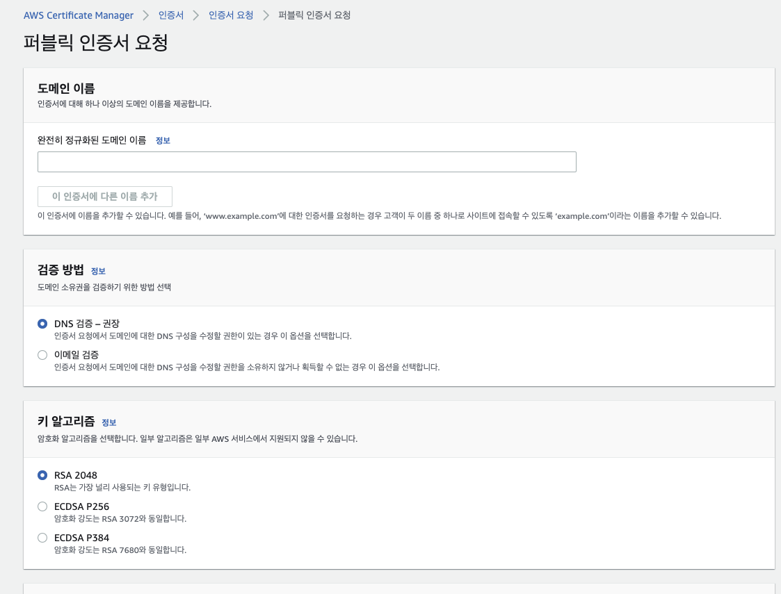 인증서 요청 -> "완전히 정규화된 도메인 이름"에 구입한 도메인 입력 후 "요청" 버튼 클릭