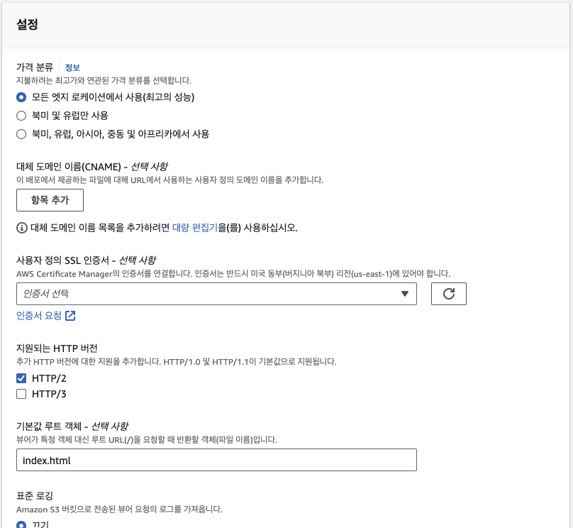 CloudFront -> 상세 -> 설정에 있는 "편집" 버튼 클릭