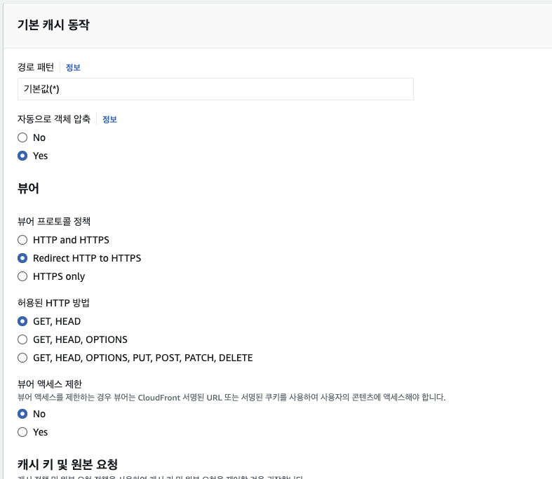 아래 "기본 캐시 동작"에 "Redirect HTTP to HTTPS" 선택