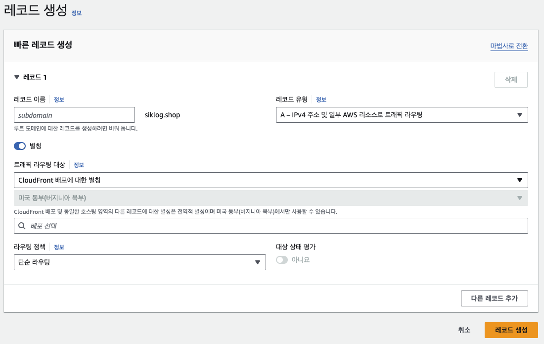 아래 "배포 선택"에 CloudFront의 배포 도메인을 선택한 후 "레코드 생성" 버튼 클릭