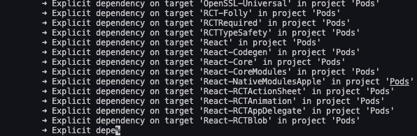 React Native App을 실행시킨 후 "i" 키 입력을 통해 ios 시뮬레이터를 실행 시켯을 때 아래 이미지와 같이 터미널에 "explicit dependency...." 라고 나오며 멈추는 오류가 발생하였다.