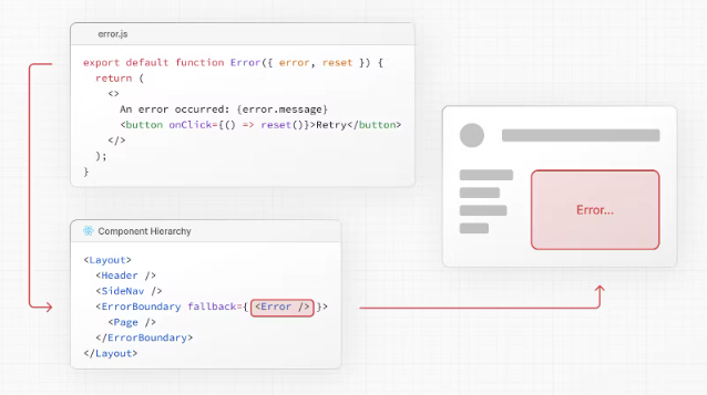 - error.js 경계는 동일 세그먼트에 선언 된 layout.js 에서 발생 되는 에러를 핸들링 하지 못합니다. 왜냐면 에러 바운더리는 레이아웃 컴포넌트 내부에 위치하기 때문입니다.