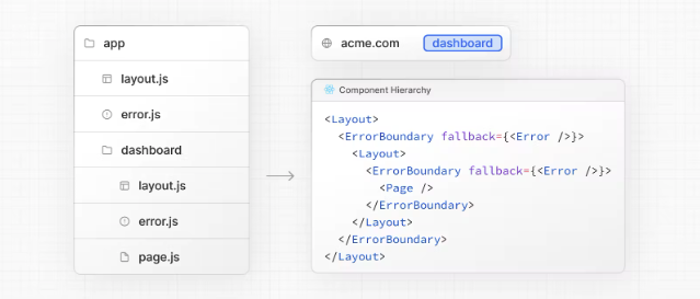 예를 들어 layout.js 파일과 error.js 파일을 가지고 있는 중첩 된 두 라우트 세그먼트는 다음의 간단한 컴포넌트 계층 구조를 가지게 됩니다.