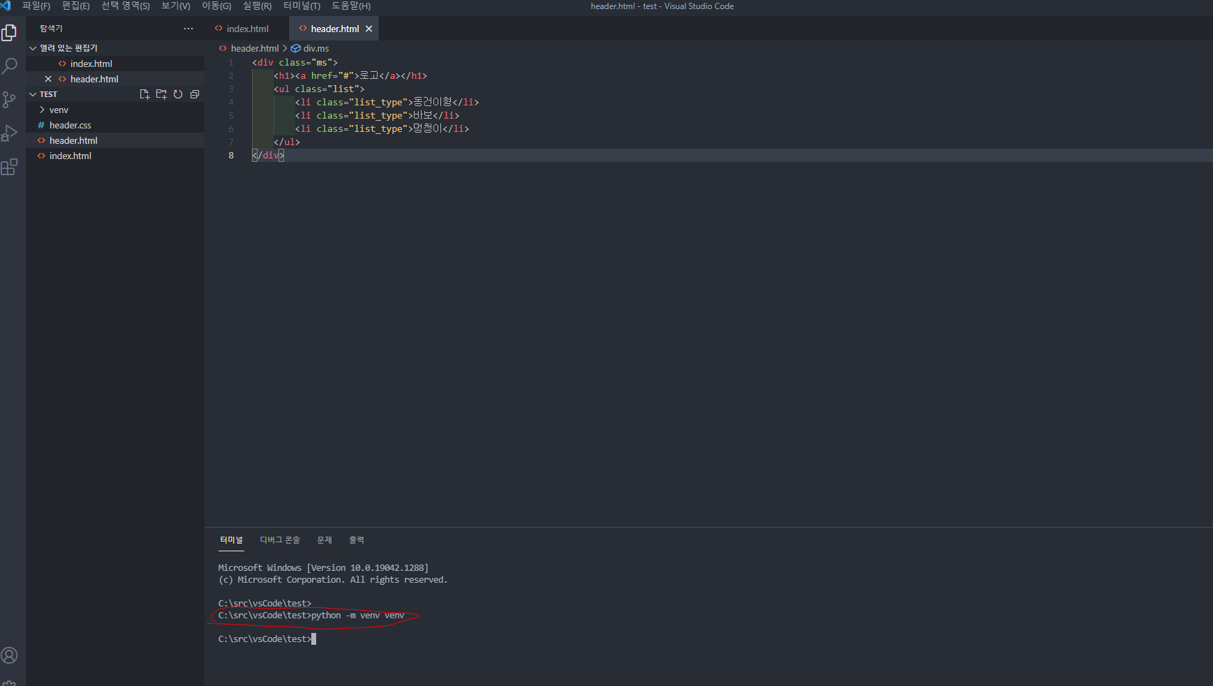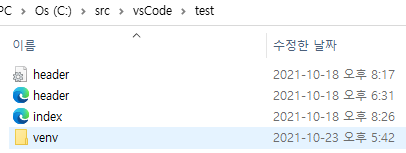 - cmd에서 python -m venv venv 실행 ⇒ venv 폴더 생성 확인
